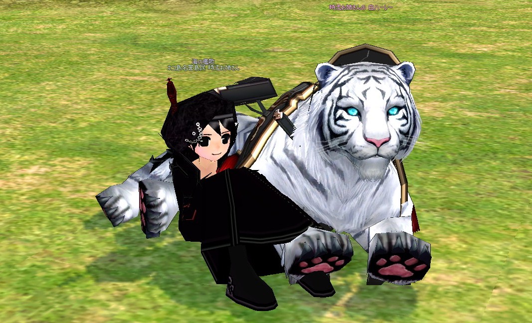 同行するは我が最良のしもべ、騎乗可能白虎の白ハーレーくんです。